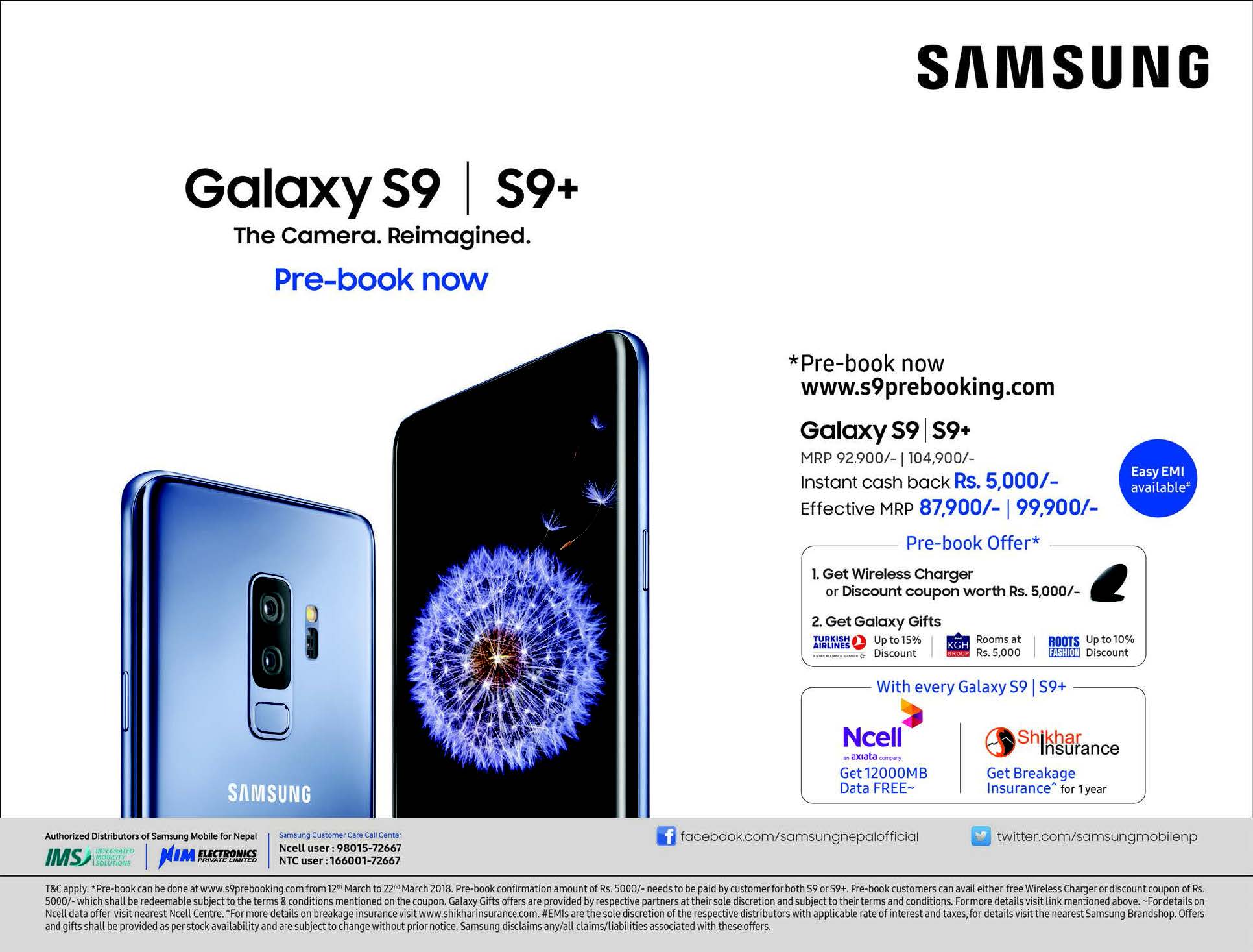 Samsung has launched its latest flagship phone Galaxy S9 and S9 plus in Nepal. Samsung Galaxy S9 Price in Nepal is 92900/- and S9 Plusprice is 104900/- according to its advertisment in Kantipur daily customers can get 5000 instant cashback and gift hampers during purchase, for booking costomers can visit www.s9prebooking.com.