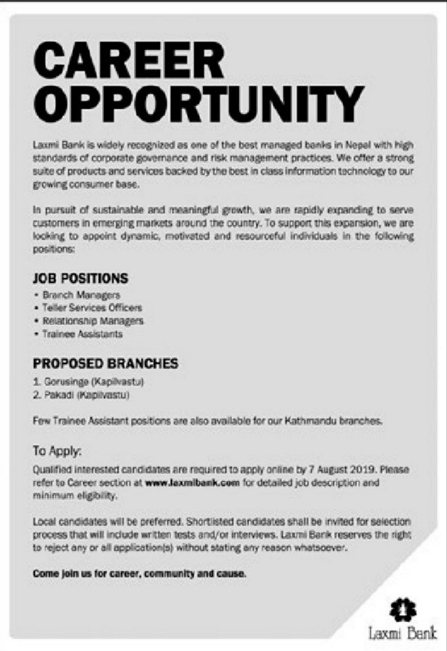 Laxmi Bank widely recognized as one of the best managed banks in Nepal is looking for dynamic, motivated and resourceful individuals in the following positions: