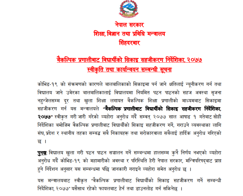 The Ministry of Education is trying to provide alternative education to the students as there is no possibility of immediate reopening of the school due to the COVID-19. For that, the Ministry has approved ‘Student Learning Facilitation Guideline 2077 through Alternative System’. The ministry has stated that the directive has been brought to facilitate learning from alternative education system including open and distance education until the school opens a comfortable environment for regular reading.