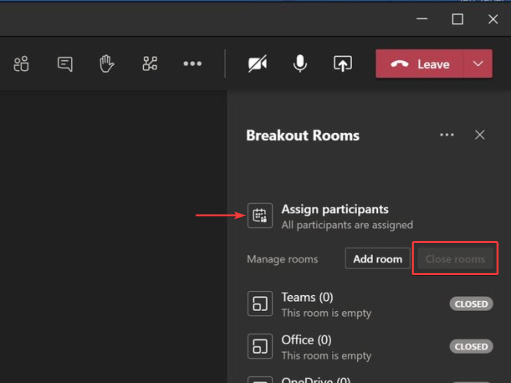 At this point, the breakout rooms will be closed for the meeting participants, and the organizer will have to click the Start rooms button to open them for discussion. Finally, to bring all participants back to the larger group when the breakout is complete, click Close rooms. This will notify all the meeting participants that they are being asked to leave the breakout rooms.
