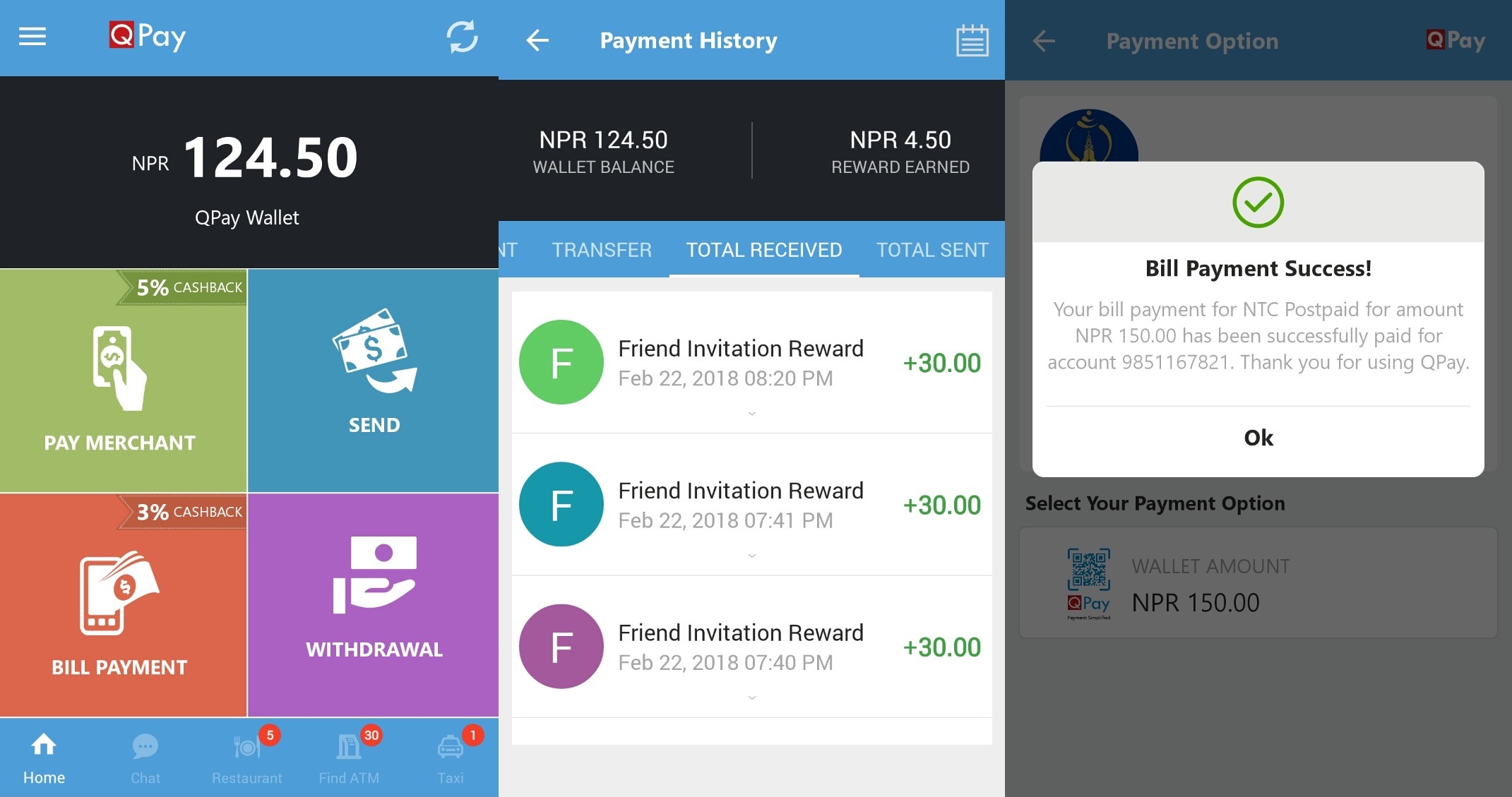 Bill payment feature provides QPay consumers the convenience to make Bill Payments with just few clicks, users can make payments of their Phone Bills NTC / Ncell / UTL / Smart Cell, Internet Subisu / ADSL / Broadlink, Cable TV (Dish Home / Net TV / SIM TV and Electricity Bills. Nearby Taxi feature can be helpful in finding a taxi and users can make payment of their taxi fares using QPay wallet. Restaurant tab in this app can help to easily search for restaurants, make an order and directly make payment. Nearby Shops feature provides graphical map view of Merchants and their details.