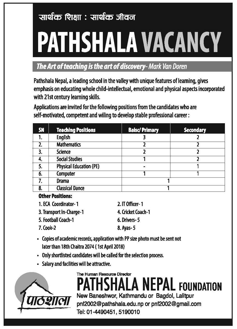 Pathshala Nepal, leading schools in the valley with unique features of learning, give emphasis on educating whole child-intellectual, emotional and physical aspects incorporated with 21 st century learning skills. Applications are invited for various positions from the candidates who are self-motivated, competent and wiling to develop Carrer Opportunity.